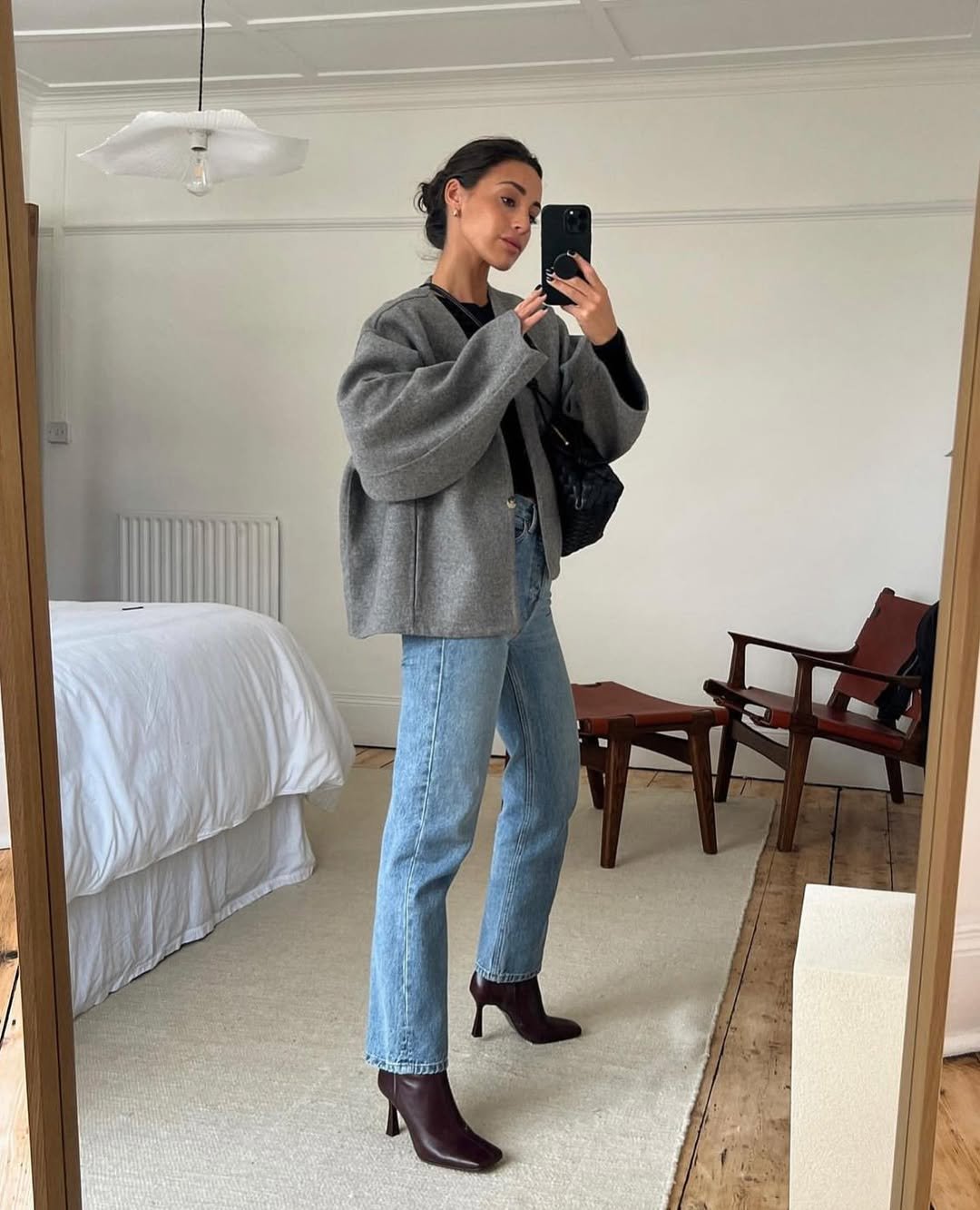 Paired with straight leg jeans and sleek ankle boots, the whole outfit feels balanced and quietly chic. It’s the kind of look that makes everyday dressing feel a little more thoughtful without ever feeling overdone.