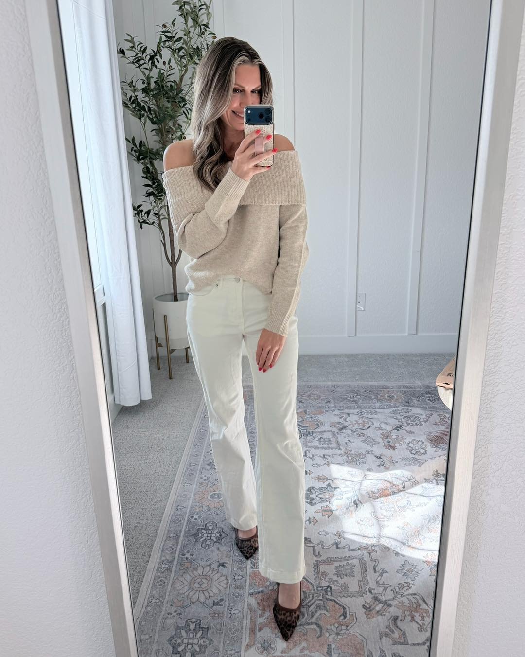 There’s something about creamy neutrals that instantly feels polished, and this look proves it. The off-shoulder knit sweater paired with crisp straight leg jeans creates that relaxed but refined balance we all secretly aim for. It’s cozy without looking sloppy, and the soft beige palette keeps everything feeling light and elevated.