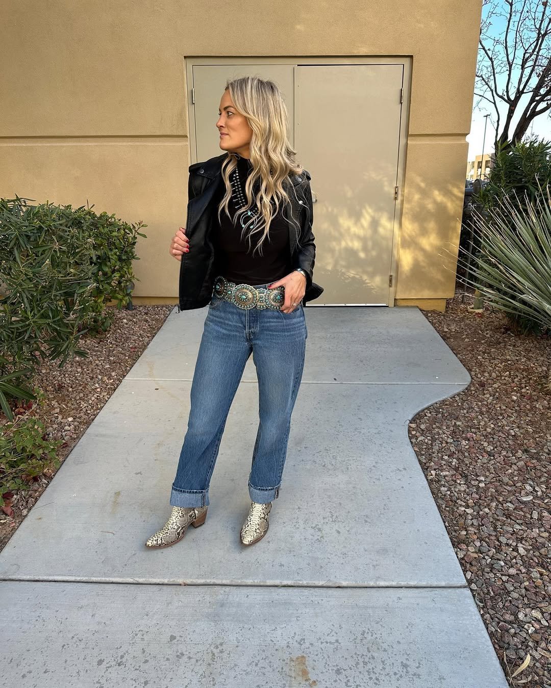 Straight leg jeans meet a little Western flair here, and the result feels confident and cool. The black top and leather jacket create a sleek base, while that bold turquoise belt adds a striking focal point that instantly elevates the denim.