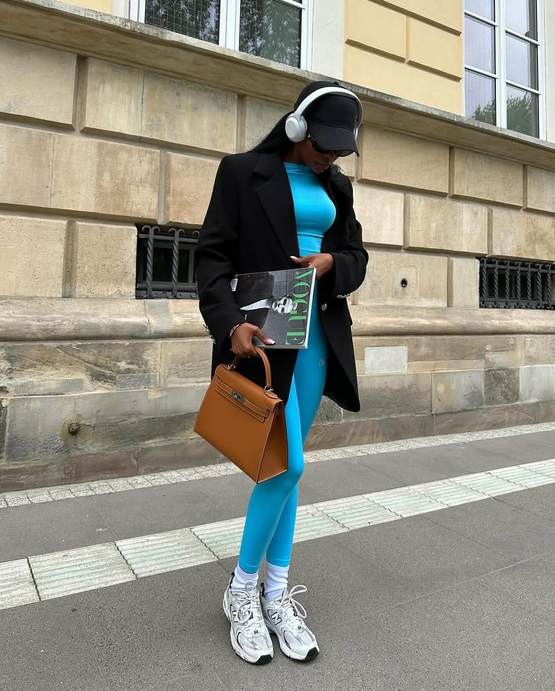 Athleisure rarely looks this polished. The bright blue matching set under a sharp black blazer feels sporty but surprisingly elevated.