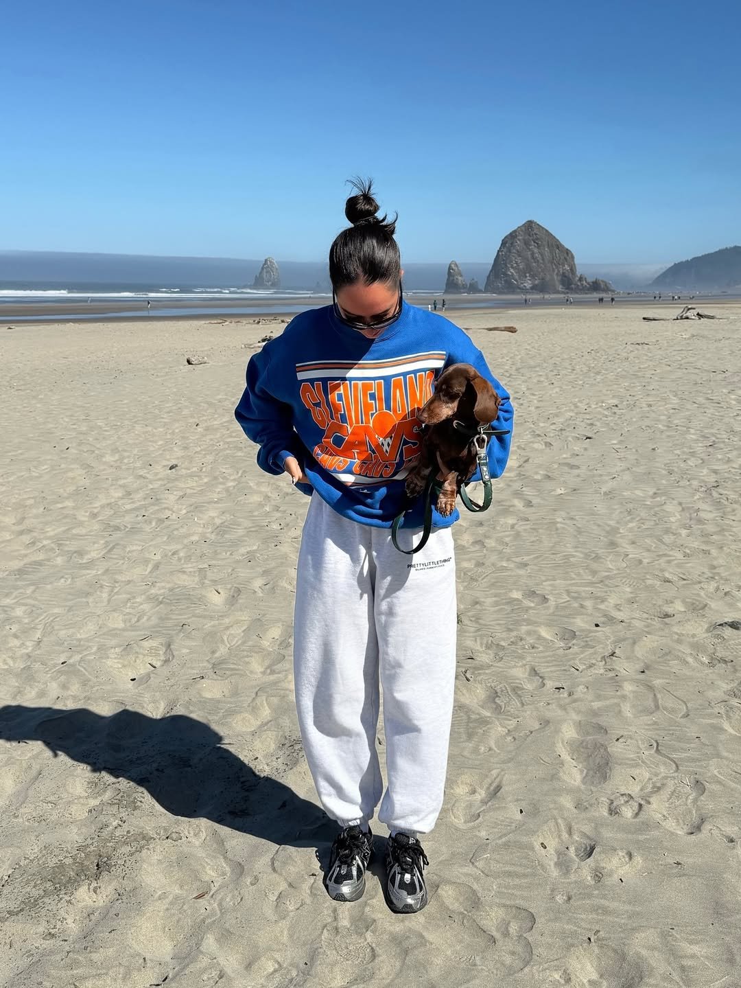 This look feels like a laid-back weekend by the ocean. The oversized Cleveland Cavs sweatshirt paired with relaxed sweatpants brings that cozy, off-duty energy we all crave.
