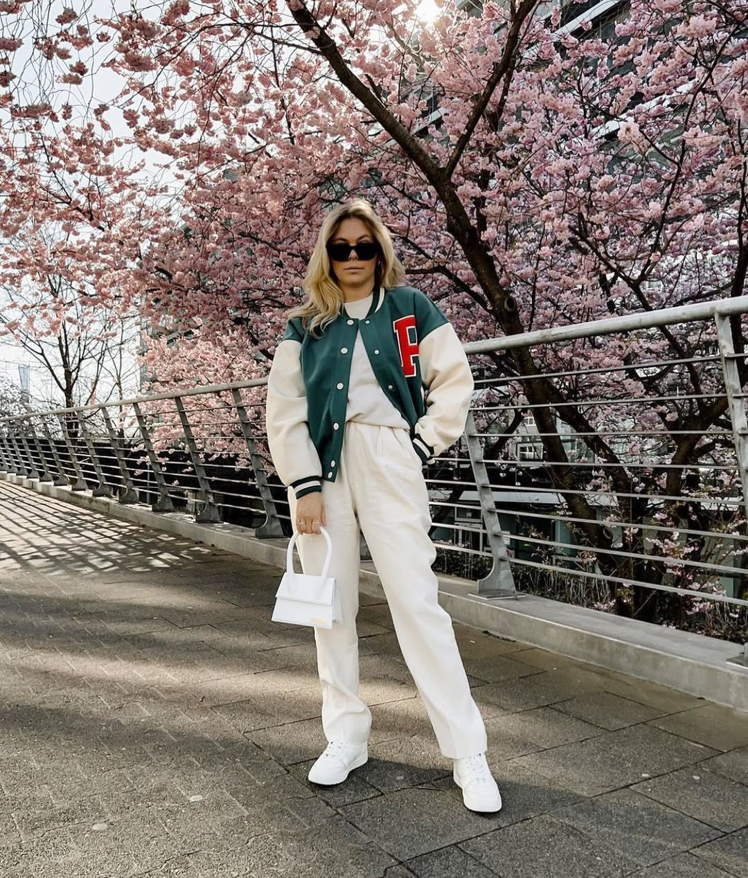 This look feels like spring in outfit form. The varsity jacket adds a sporty edge, while the soft cream set underneath keeps things light and relaxed.