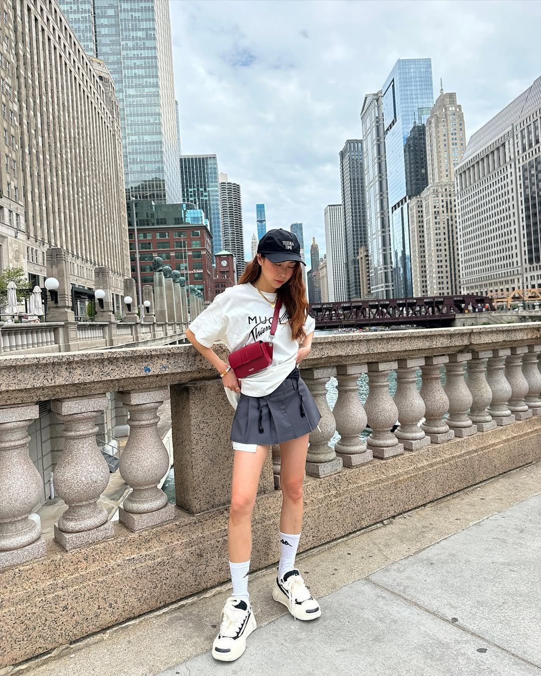 A pleated mini skirt and oversized tee always hit that perfect balance between sporty and playful. Add chunky sneakers and a cap, and suddenly the whole outfit feels ready for a day exploring the city.