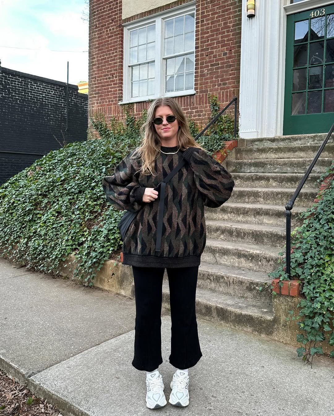Oversized knitwear always brings a sense of comfort, and this look leans fully into it. The patterned sweater paired with black flared pants feels relaxed but still put together.