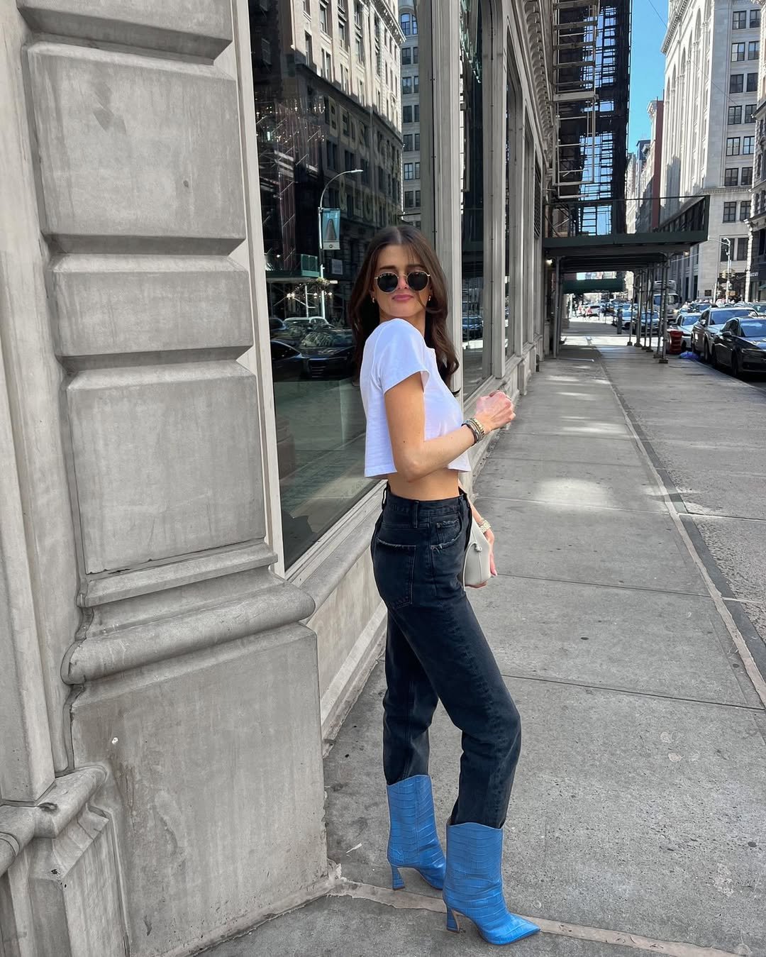 A simple white crop top and dark denim is already a classic combo, but those bold blue boots completely change the game. Suddenly the outfit feels playful and fashion-forward without losing its everyday vibe.