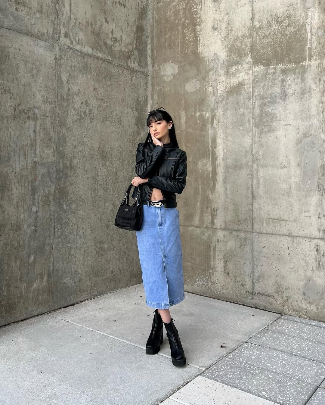 There’s something quietly powerful about this look. The cropped leather jacket paired with a simple denim midi skirt creates that perfect mix of tough and feminine without trying too hard.