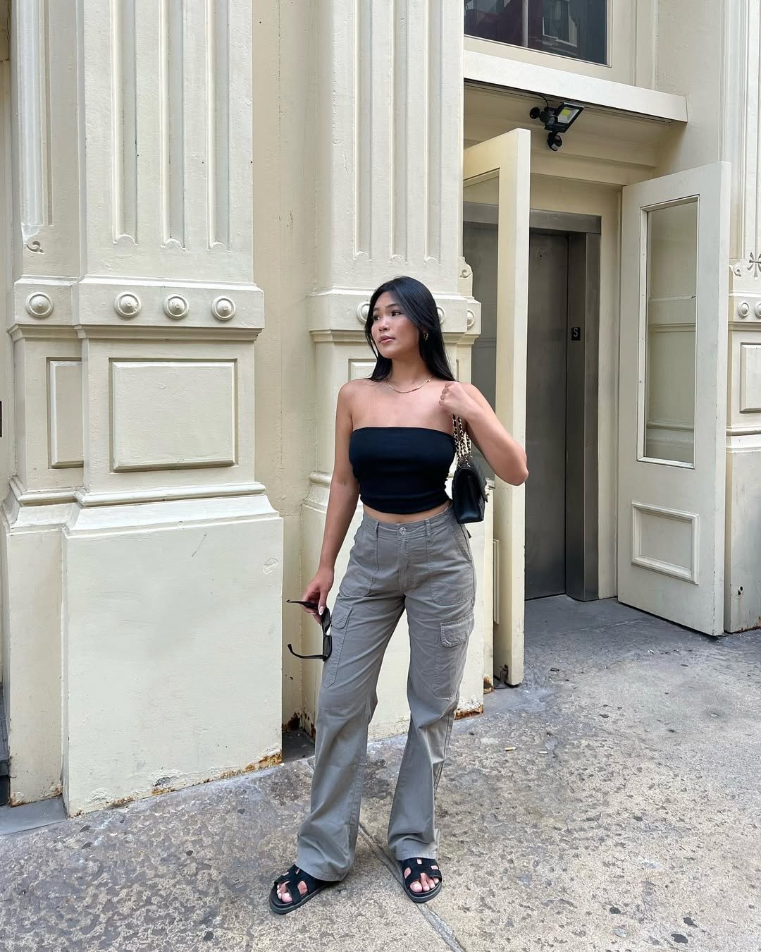 This look is the definition of relaxed street style done right. The black tube top paired with loose cargo pants keeps things minimal but still interesting, especially with those chunky sandals grounding the outfit.