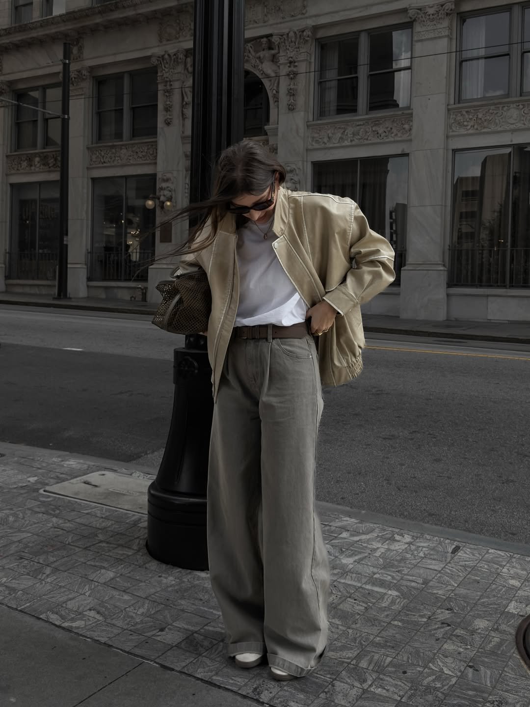 The neutral tones keep everything calm and polished. It feels like the kind of outfit you’d wear wandering through the city with a coffee in hand.