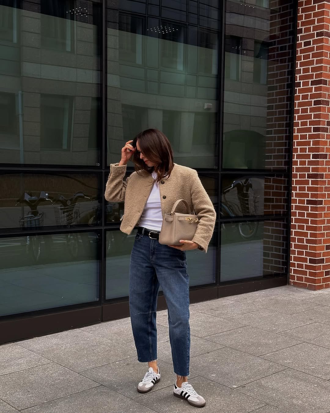 Sometimes the simplest outfits end up being the most stylish. A cropped jacket, classic denim, and crisp white sneakers—there’s something timeless about this combination.