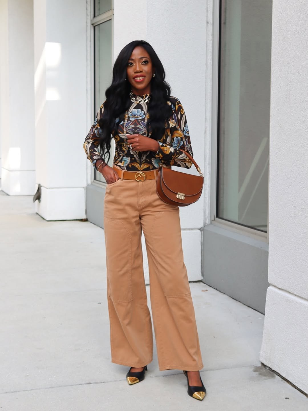 This look is a masterclass in mixing color and pattern without it feeling chaotic. The floral top paired with warm-toned trousers creates a rich, layered palette that feels both bold and sophisticated.