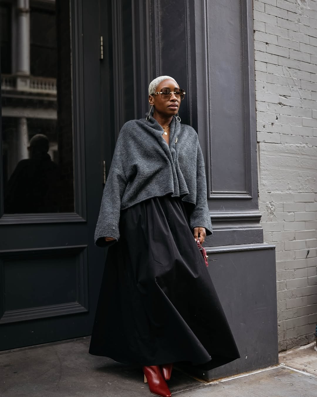 This outfit leans into elegance without feeling overly polished. The oversized grey knit layered over a flowing black skirt creates that beautiful mix of structure and movement.