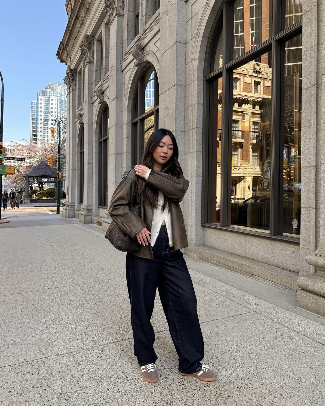 This outfit has that perfect everyday city vibe. The oversized leather jacket layered over soft knits and loose denim creates an easy, slightly vintage-inspired look.