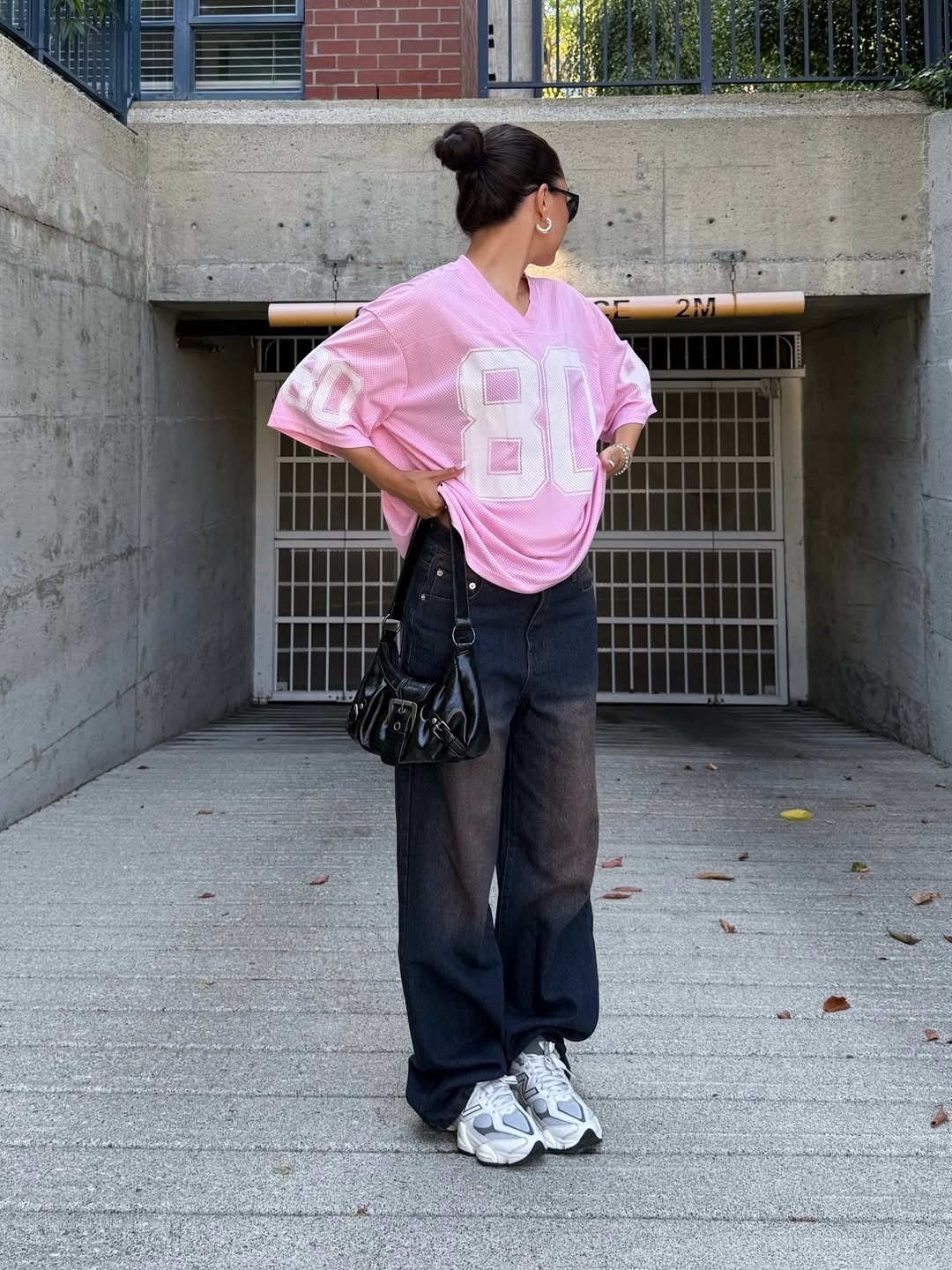 There’s something about an oversized jersey that instantly gives off cool-girl confidence. The soft pink “80” top paired with baggy dark denim and chunky sneakers feels relaxed, playful, and very much in that off-duty streetwear lane.