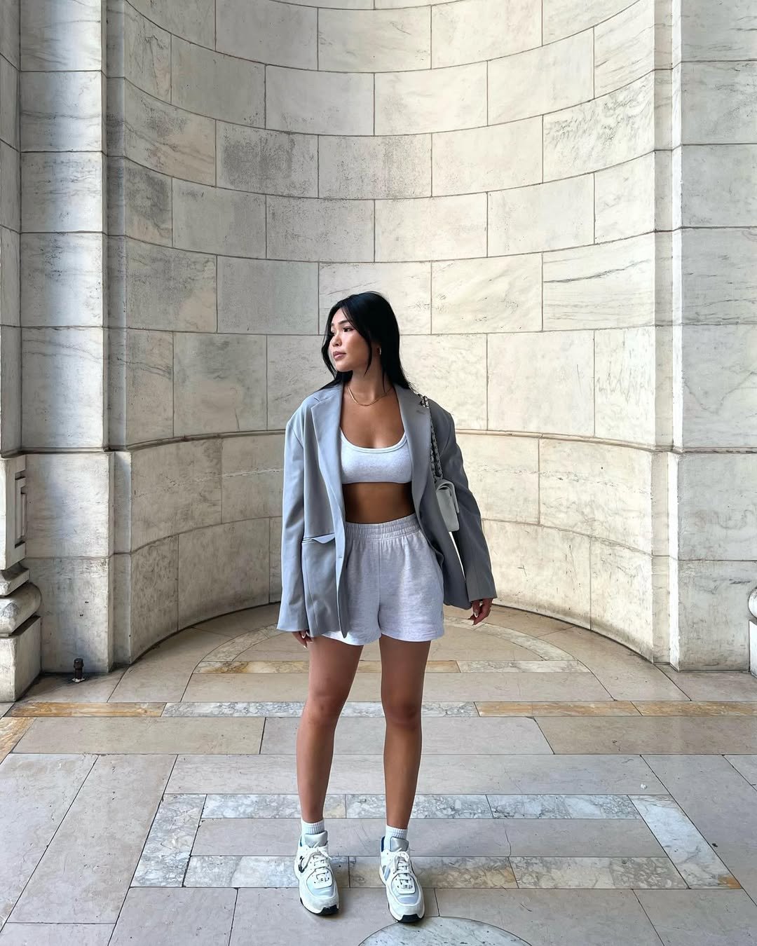 This look is a great example of how athleisure can still feel elevated. A simple sports bra and relaxed shorts instantly read casual, but the oversized blazer shifts the whole vibe.