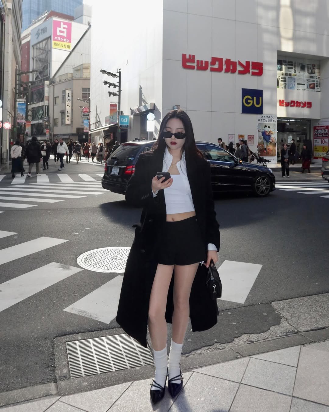This outfit has that sharp, metropolitan energy. The long black coat layered over a simple crop top and mini skirt instantly creates a sleek silhouette.