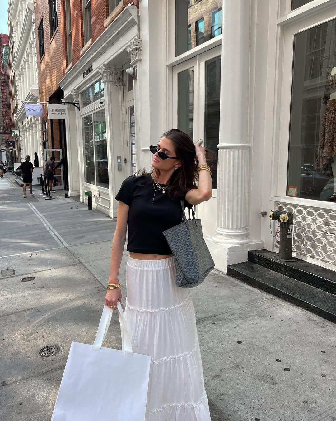 A black fitted tee and a tiered white skirt is such a simple combination, but it somehow always feels fresh. The contrast between the dark top and airy skirt creates that effortless balance between polished and relaxed.