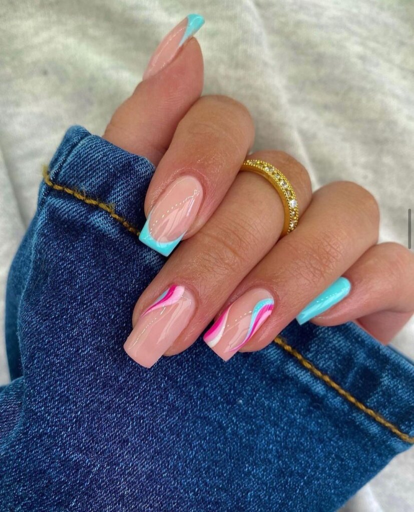 Classic French tips get a spring remix here with pops of aqua and flowing pink swirls. The glossy nude base keeps everything balanced and wearable.