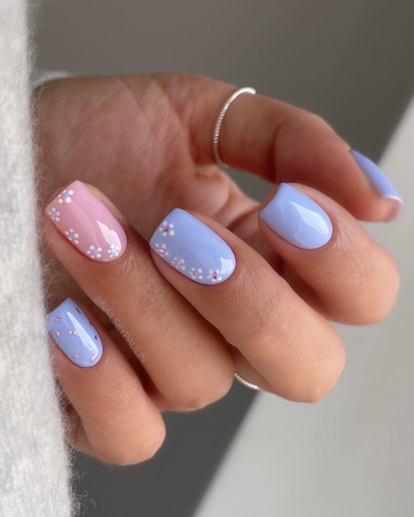 There’s something so charming about this soft blue and blush combo. The tiny floral accents feel delicate and sweet, especially on shorter nails.
