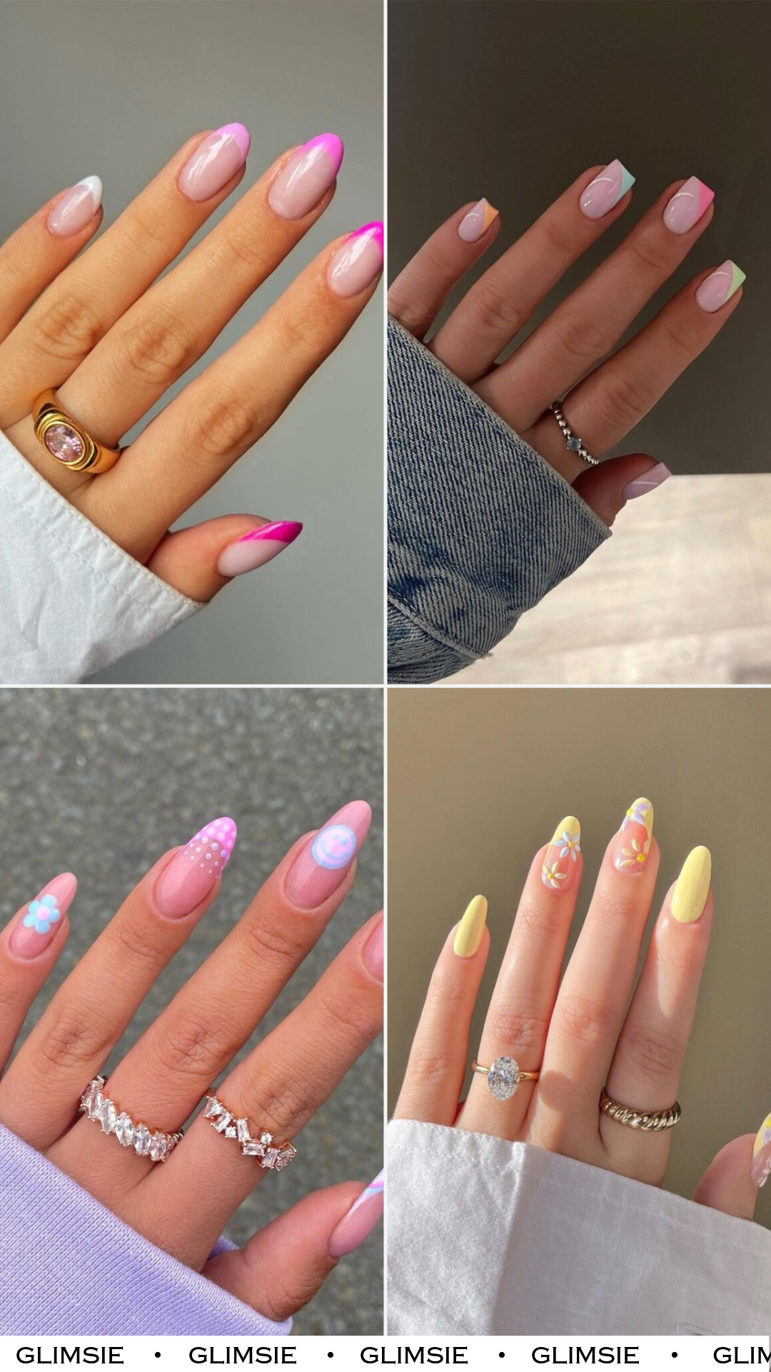 These nails feel like a mood board of good vibes. Baby pinks, soft purples, tiny florals, and even a smiley moment all live together so effortlessly.