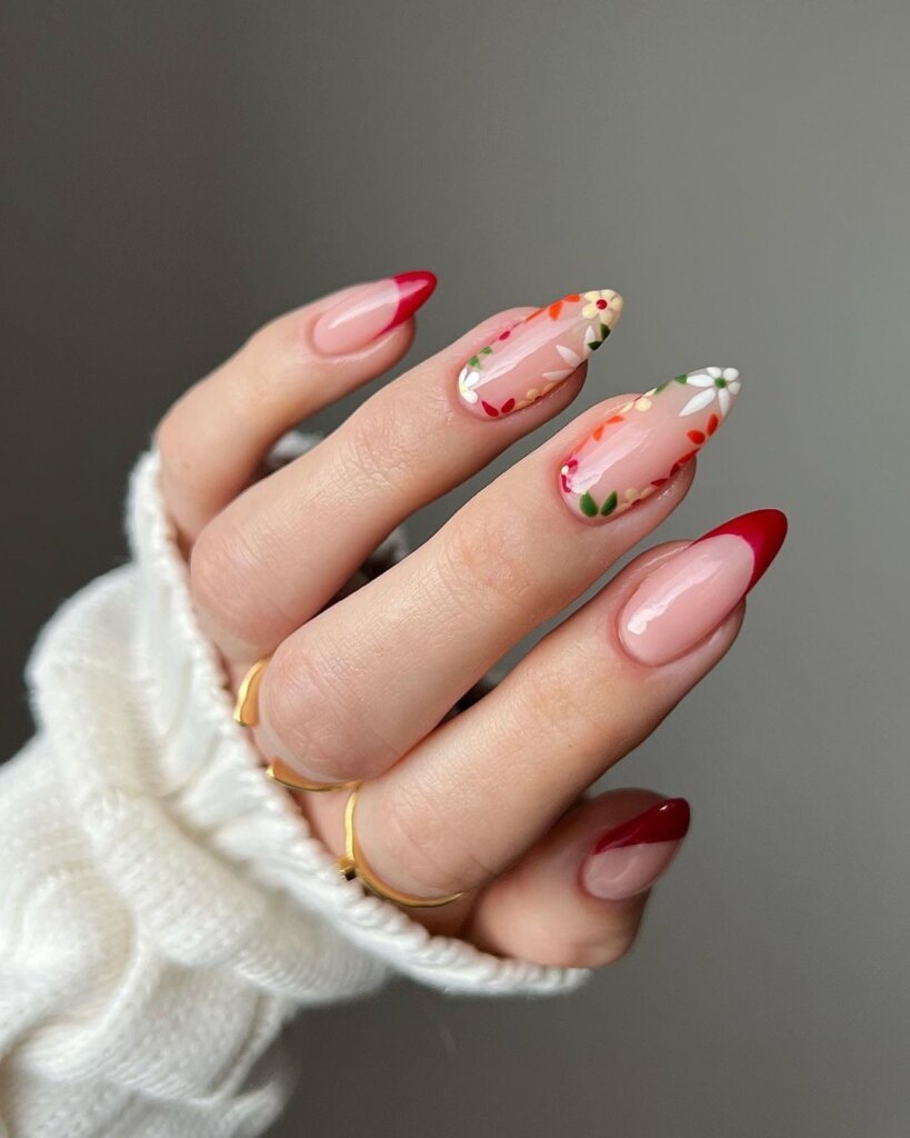 Classic red tips get a spring refresh with delicate floral accents scattered across a glossy nude base. It’s romantic without feeling too precious.