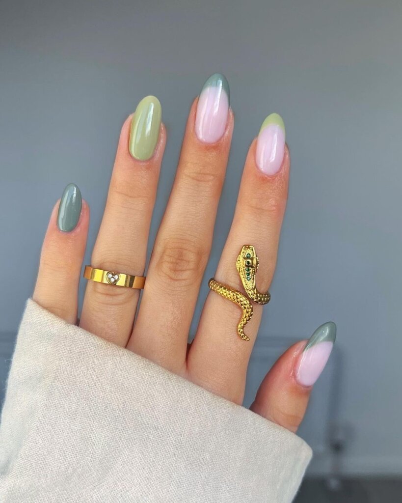 These muted green tips feel like spring easing in quietly—fresh, calm, and a little unexpected. The glossy finish keeps everything polished, while the soft color mix gives that effortless “I didn’t overthink this” energy.