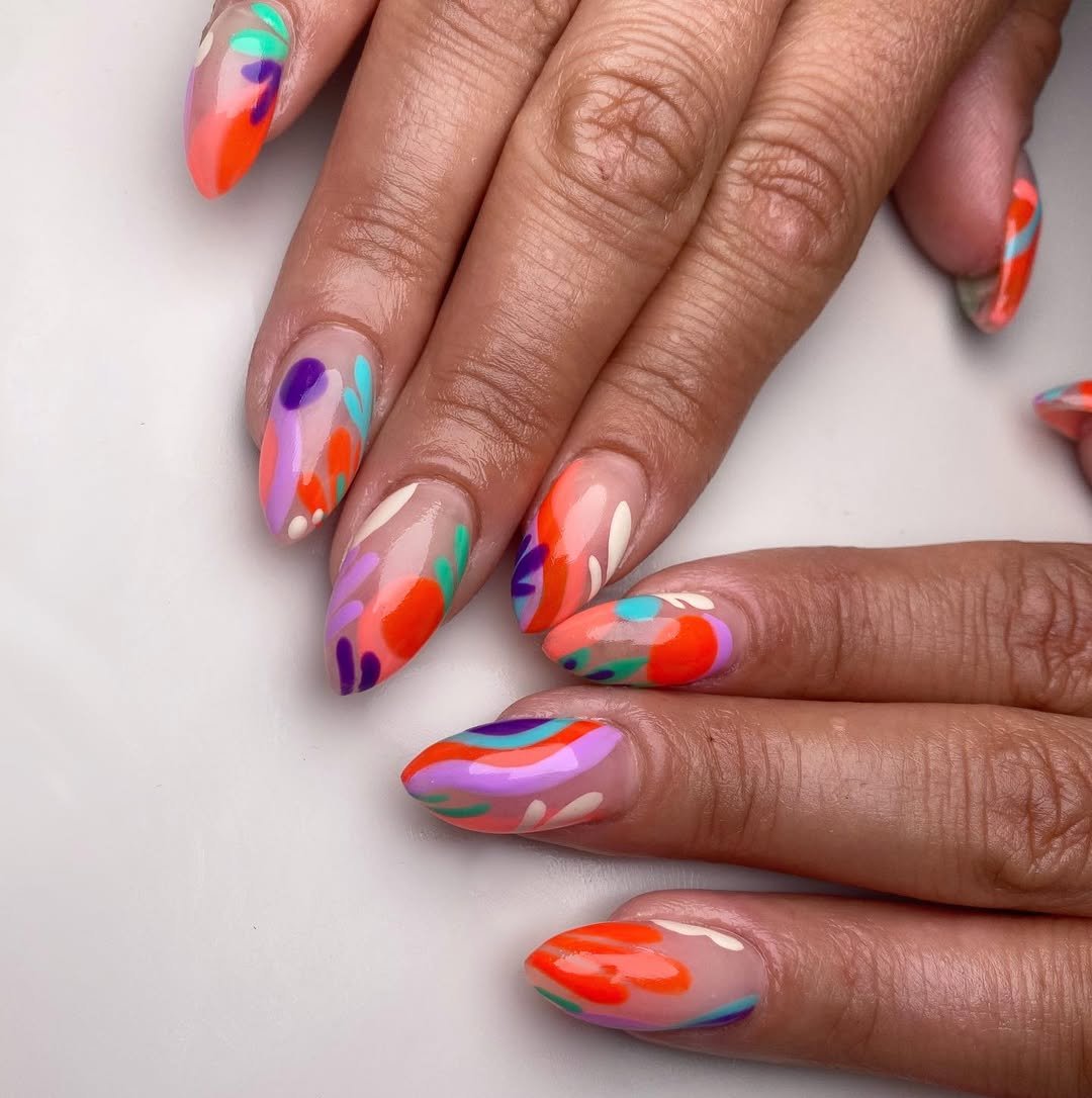 Soft nude bases become a canvas for fluid strokes of orange, lilac, teal, and cream, layered in a way that feels effortless and painterly. No two nails are exactly the same, and that’s where the magic lives.