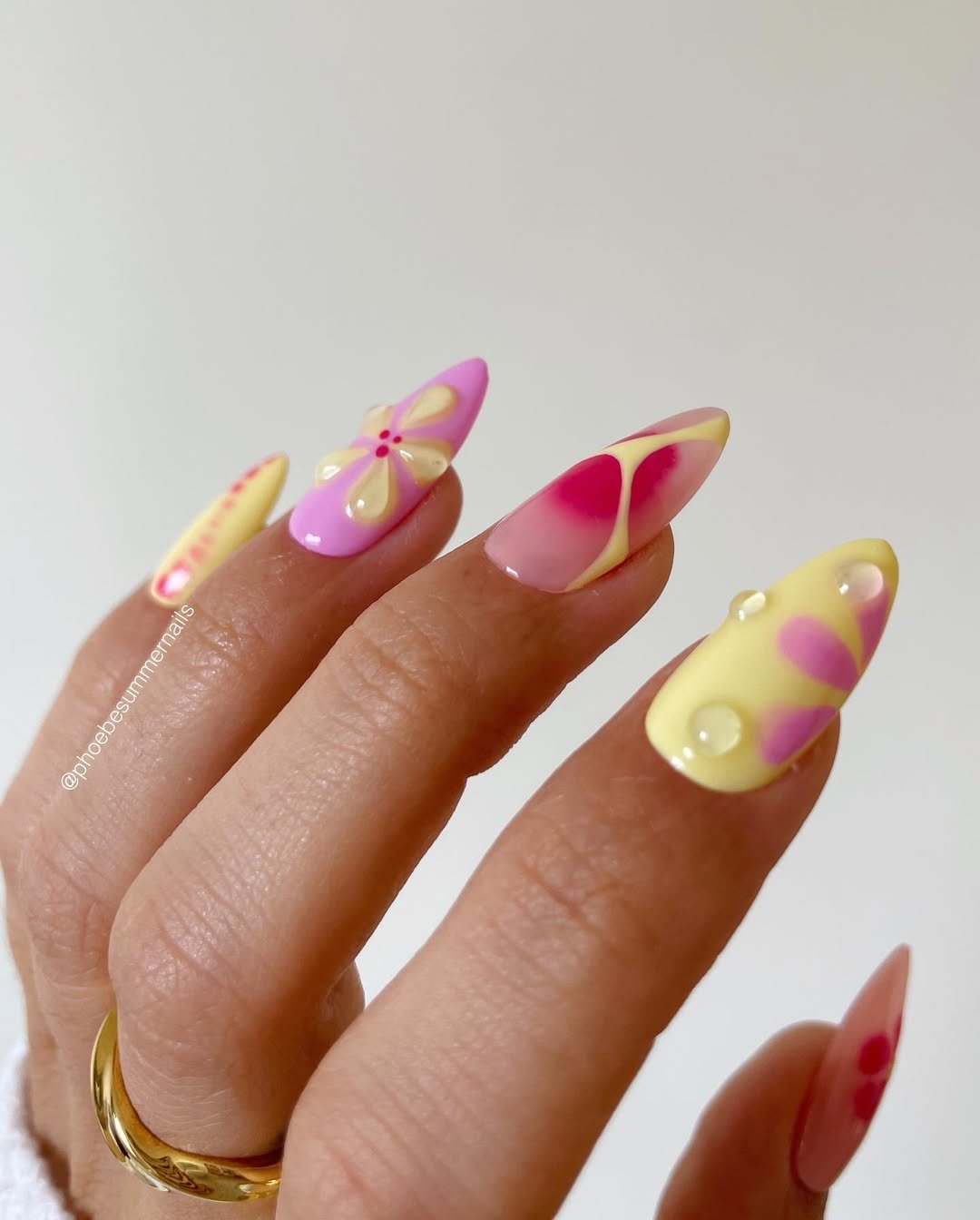 Glossy pastel bases meet bold pink florals and playful shapes that feel straight out of a retro summer mood board. The mix of soft and bright keeps it from feeling too sweet.
