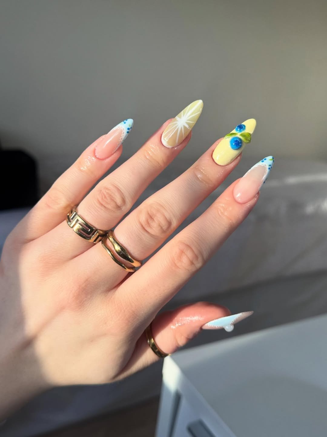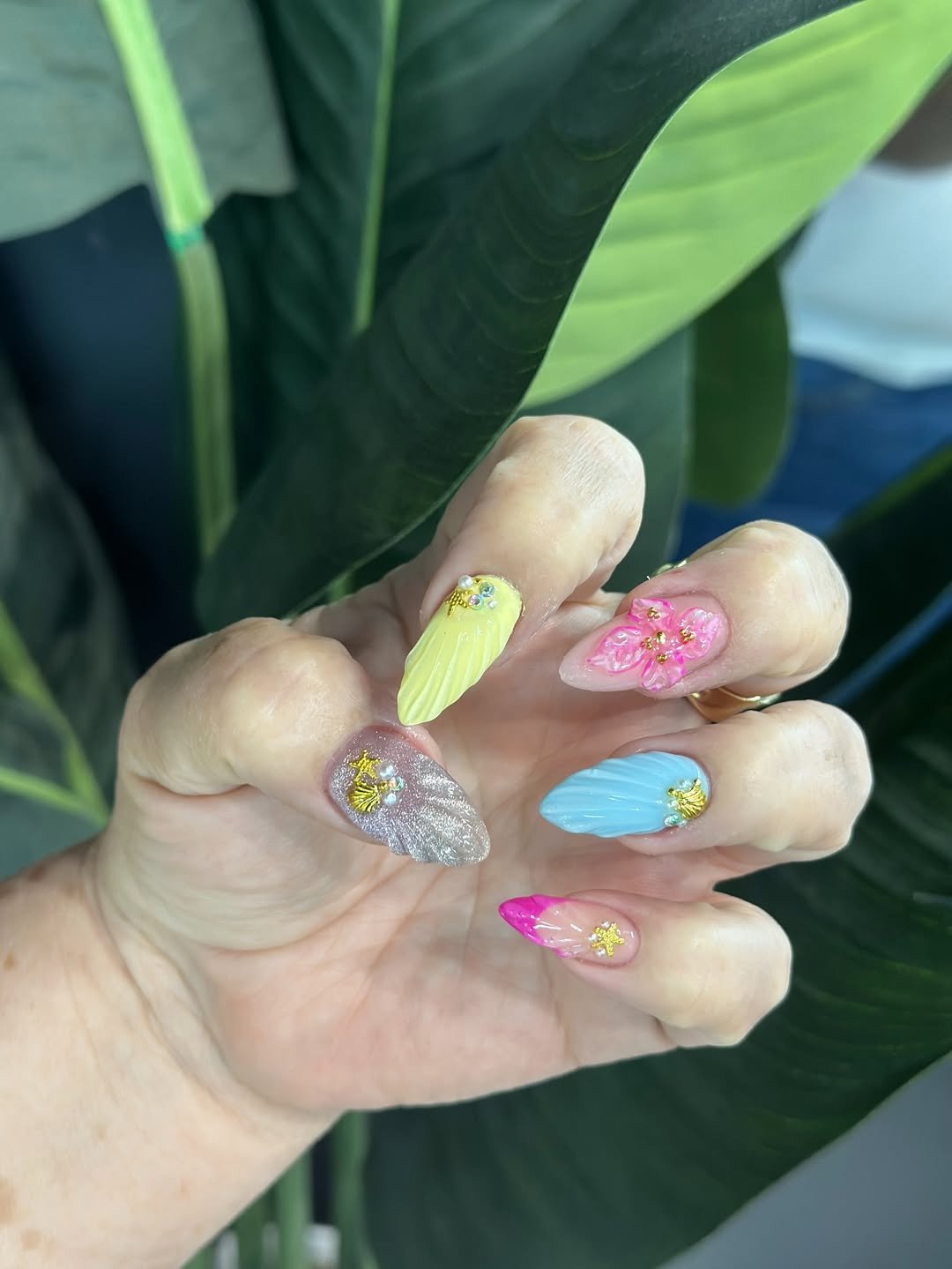 Soft yellows, baby blues, and blush pinks come together with sculpted shell textures and tiny gold details that feel almost vintage. Each nail has its own story, but the palette ties it all together.