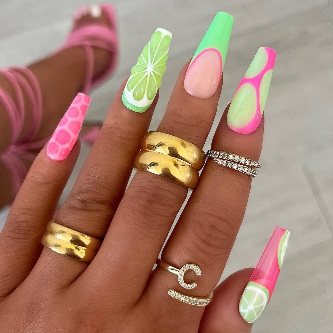 Lime slices, soft pinks, and glossy neon accents come together in a way that feels straight out of a poolside afternoon. The mix of fruit-inspired art and smooth gradients keeps things playful without feeling chaotic.