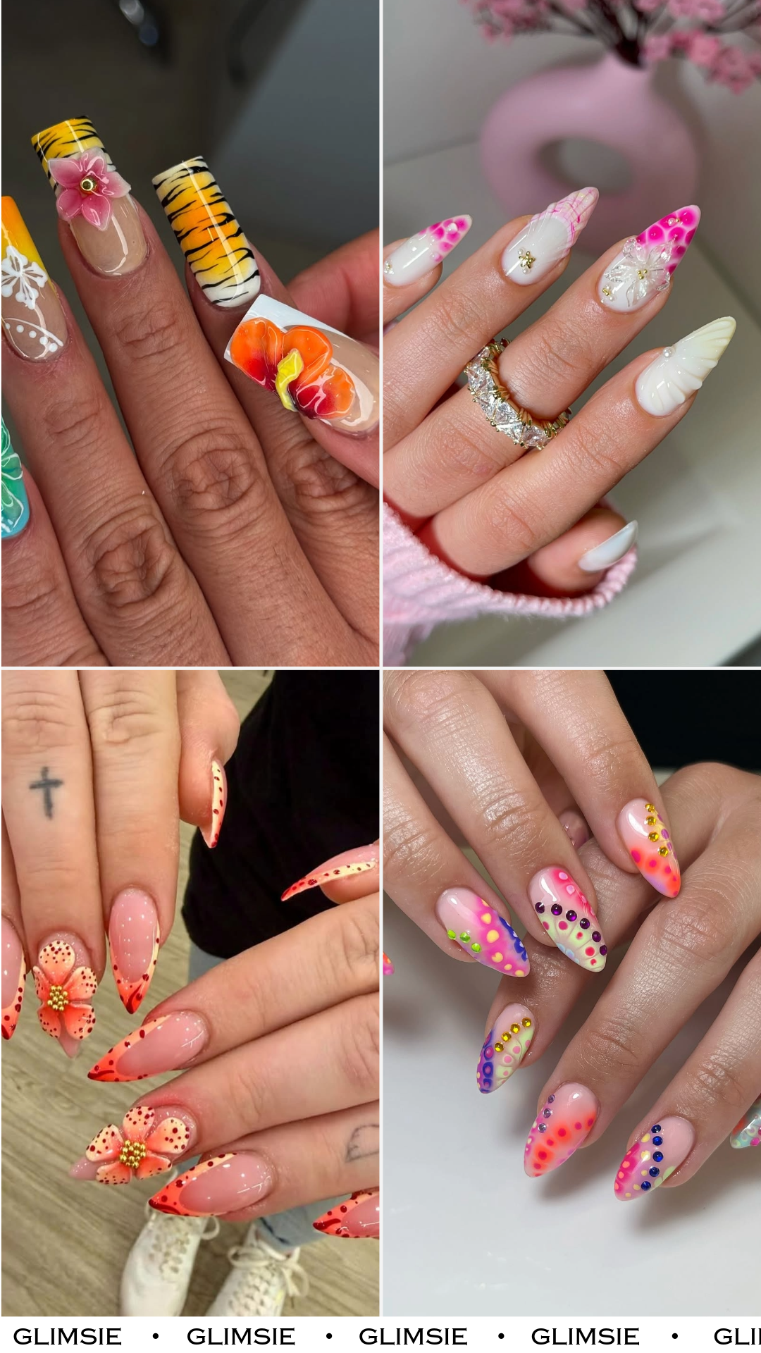 Leopard print, bright florals, and glossy nude bases come together in a way that feels unapologetically fun. The pops of neon keep everything lively, while gold accents add just a hint of polish.