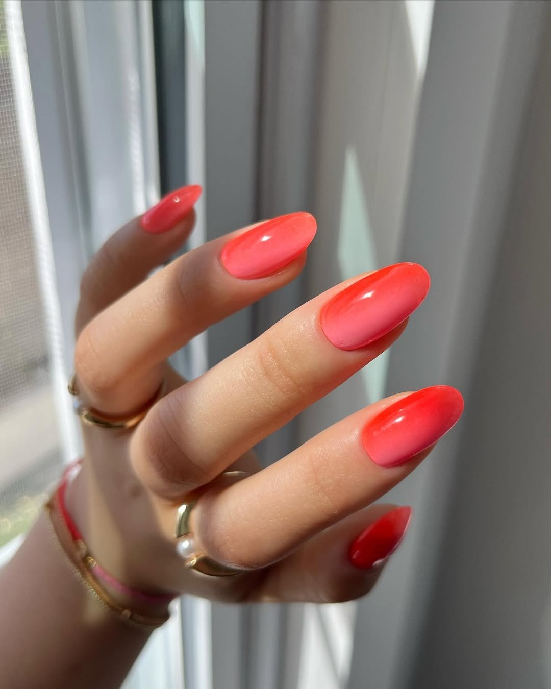 A juicy coral fades gently across each nail, creating that barely-there ombré that looks like it’s glowing from within. No extra details, no distractions, just color doing what it does best.