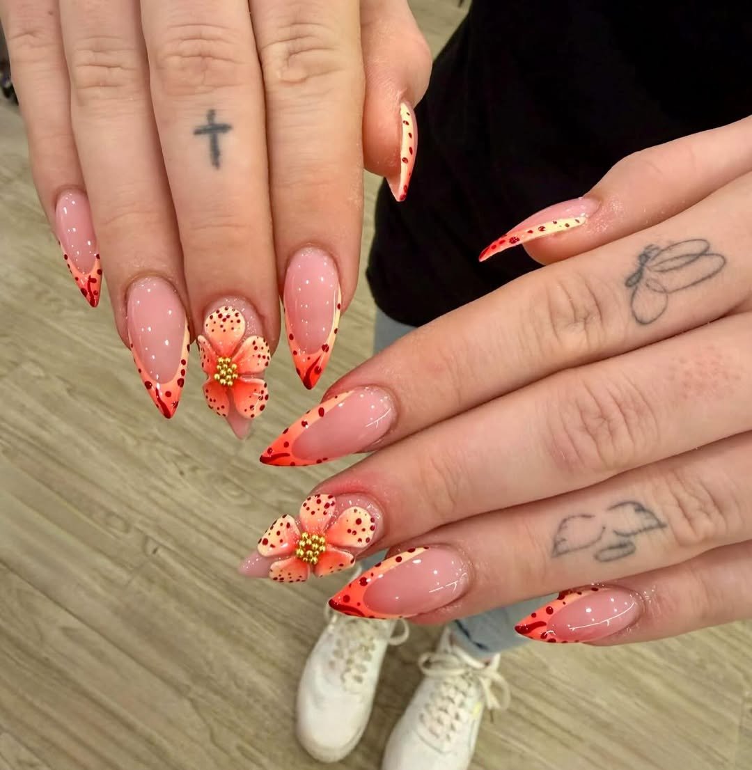 A classic almond shape gets a warm update with coral-toned tips and tiny dotted details that echo the center of a flower. The 3D bloom accent adds just enough drama without overwhelming the set.