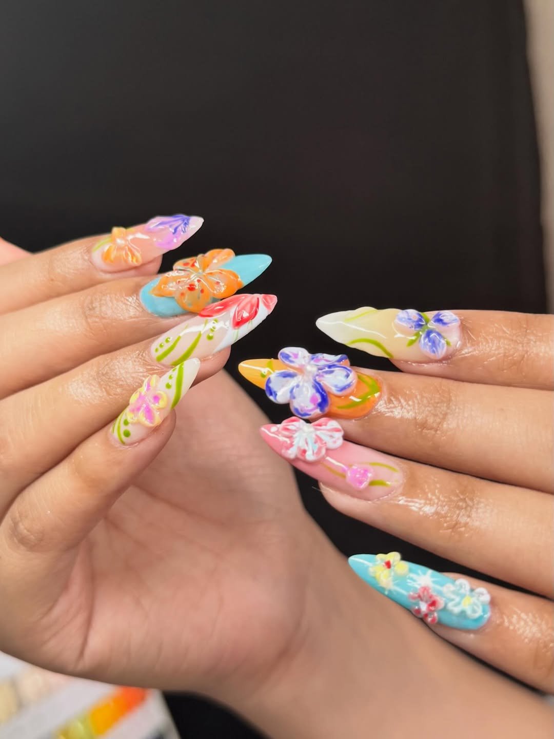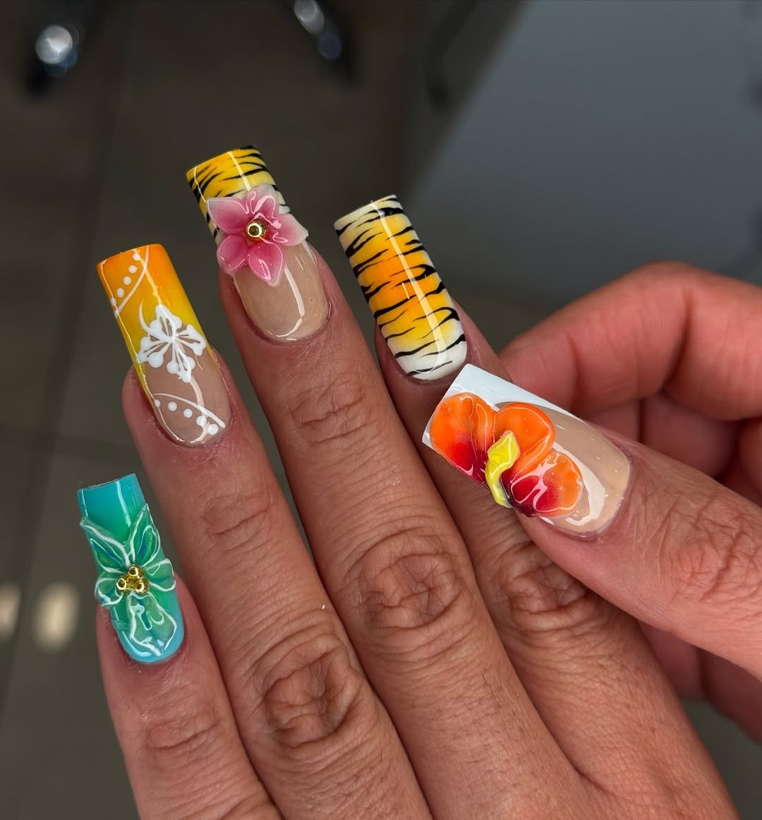 This set leans into contrast with bold color blocking, floral accents, and even a hint of animal print layered across long square tips. It’s vibrant, detailed, and full of personality.