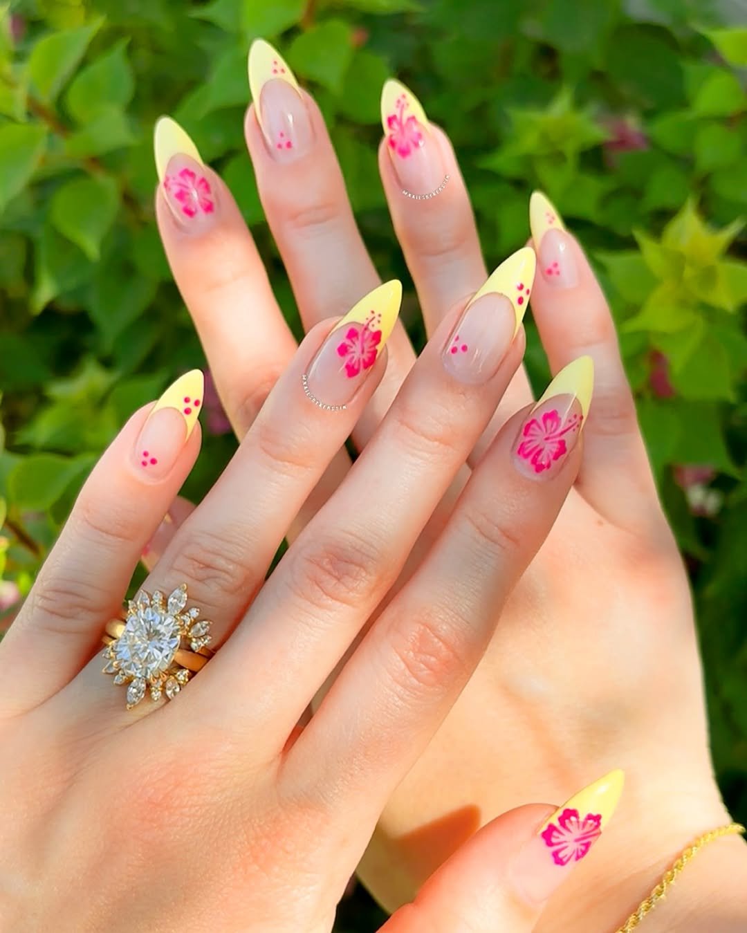 Soft nude bases meet buttery yellow tips, finished with delicate pink florals that feel like they’ve been painted in the garden. The color pairing is fresh without trying too hard.