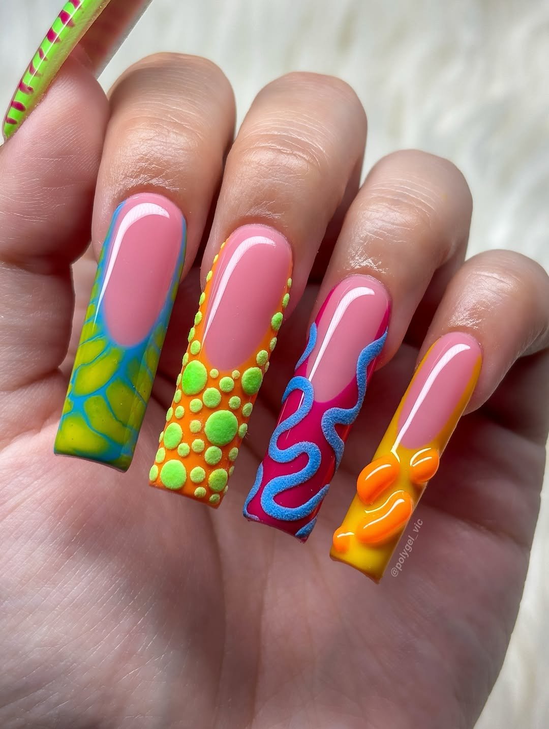 This set feels like summer turned all the way up. Electric greens, citrus orange, and hot pink collide with raised textures that almost look touchable, like tiny bubbles and ripples frozen mid-motion.
