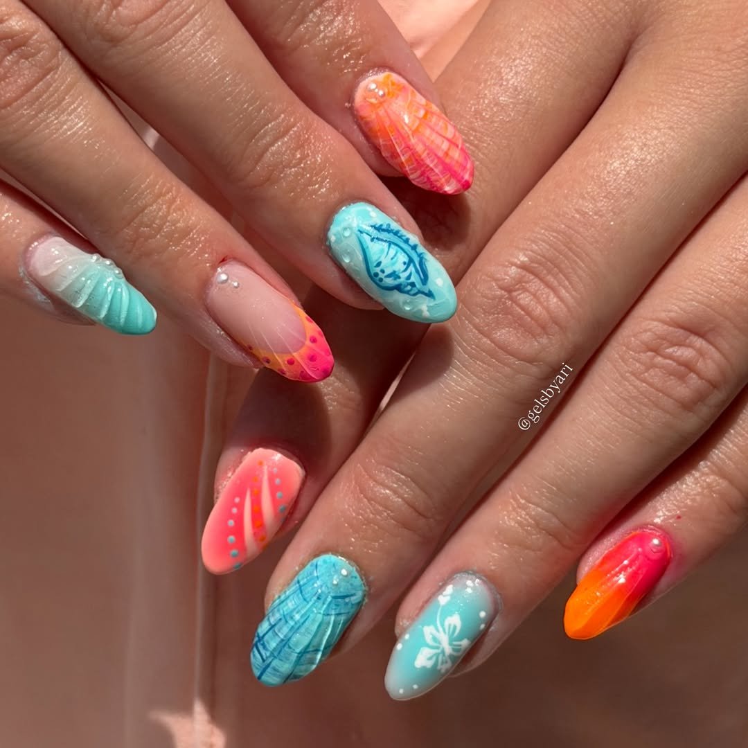 This set leans bold, but the palette keeps it grounded. It’s the kind of manicure that makes you want to book a beach trip immediately.