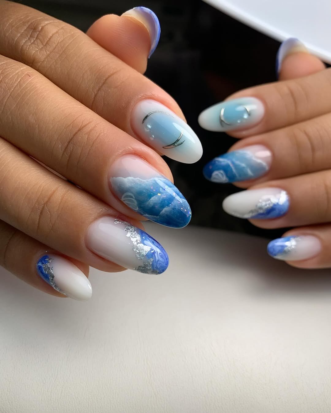 Soft milky whites fade into inky blues, with delicate silver foil tracing the edges like sea foam catching the tide. The marbled effect feels fluid and calming, almost like watching waves roll in.