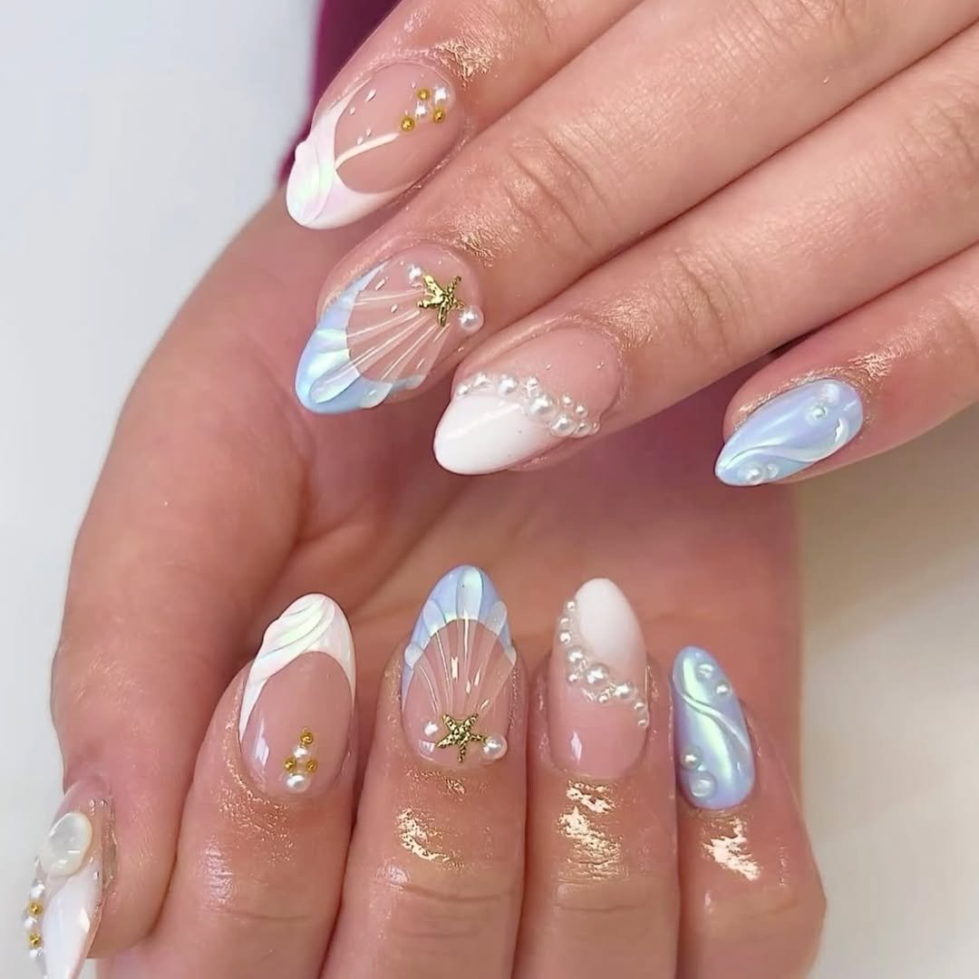Think iridescent shells, soft pearls, and that glossy, just-out-of-the-water finish. The mix of sculpted details and sheer pink bases keeps everything light, while tiny gold accents add a refined touch.