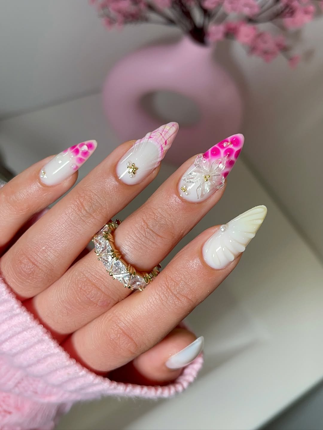 Milky white bases meet pops of hot pink, layered florals, and a touch of sparkle that feels straight out of a summer daydream. Each nail brings a different detail, but it all ties together effortlessly.
