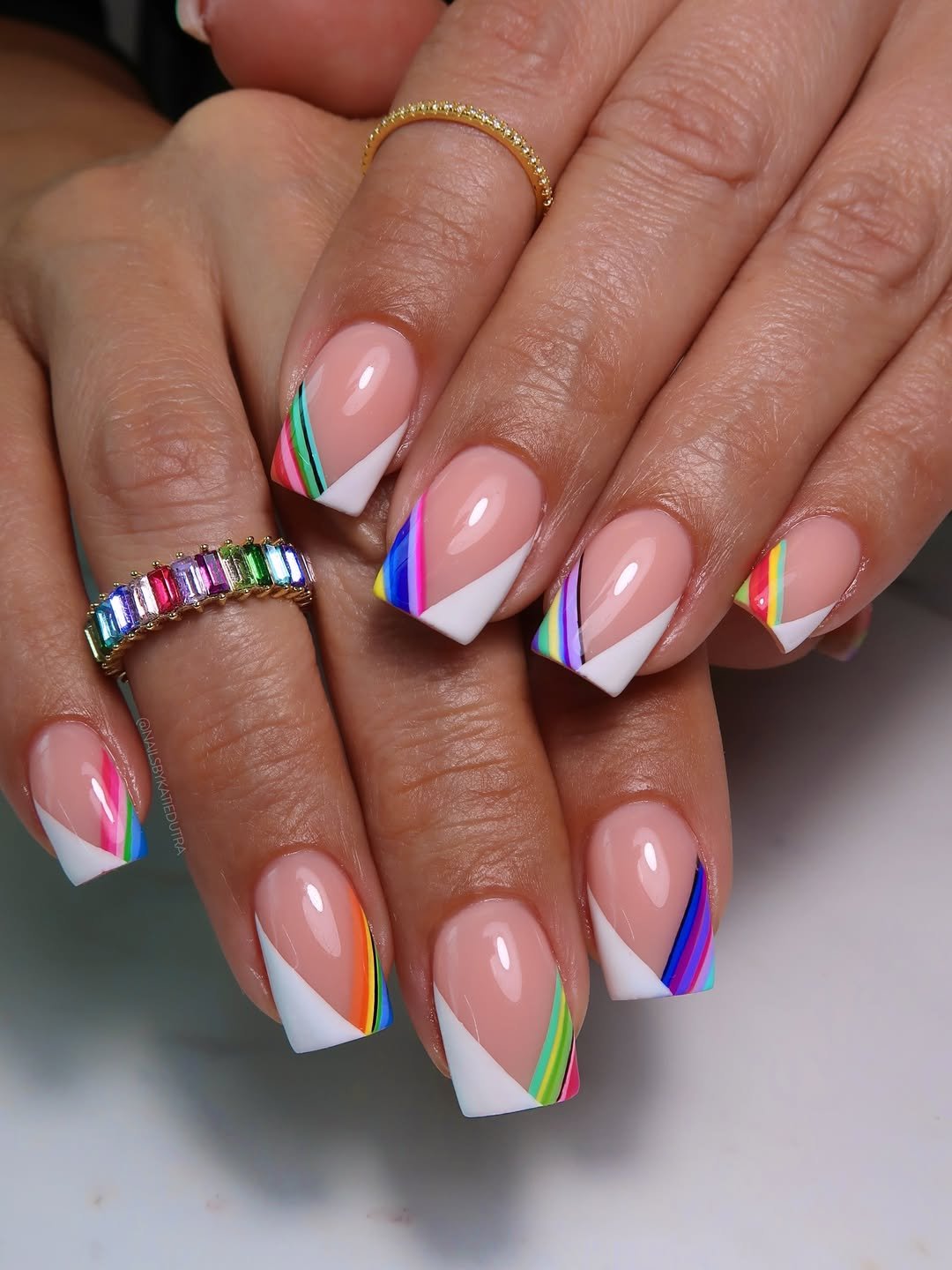 Classic white French tips get a playful twist with sharp diagonal lines and vibrant rainbow accents that peek through just enough. The clean base keeps everything balanced.