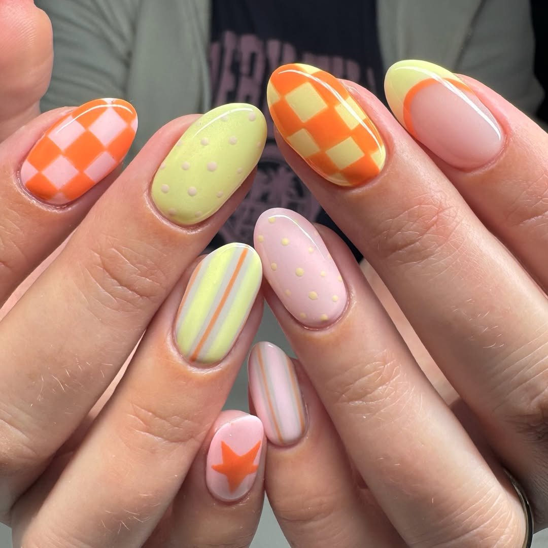 This set feels like a sunny afternoon packed into ten tiny canvases. Tangerine checkerboards, soft pistachio greens, and candy pink bases all play together in a way that feels playful but still polished. The mix of stripes, dots, and that little star moment keeps it from ever feeling too predictable.