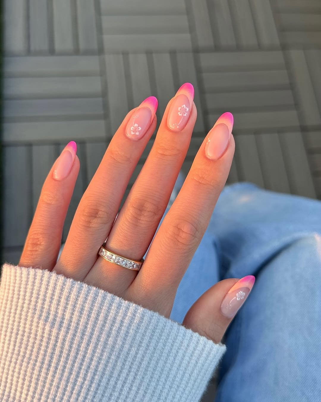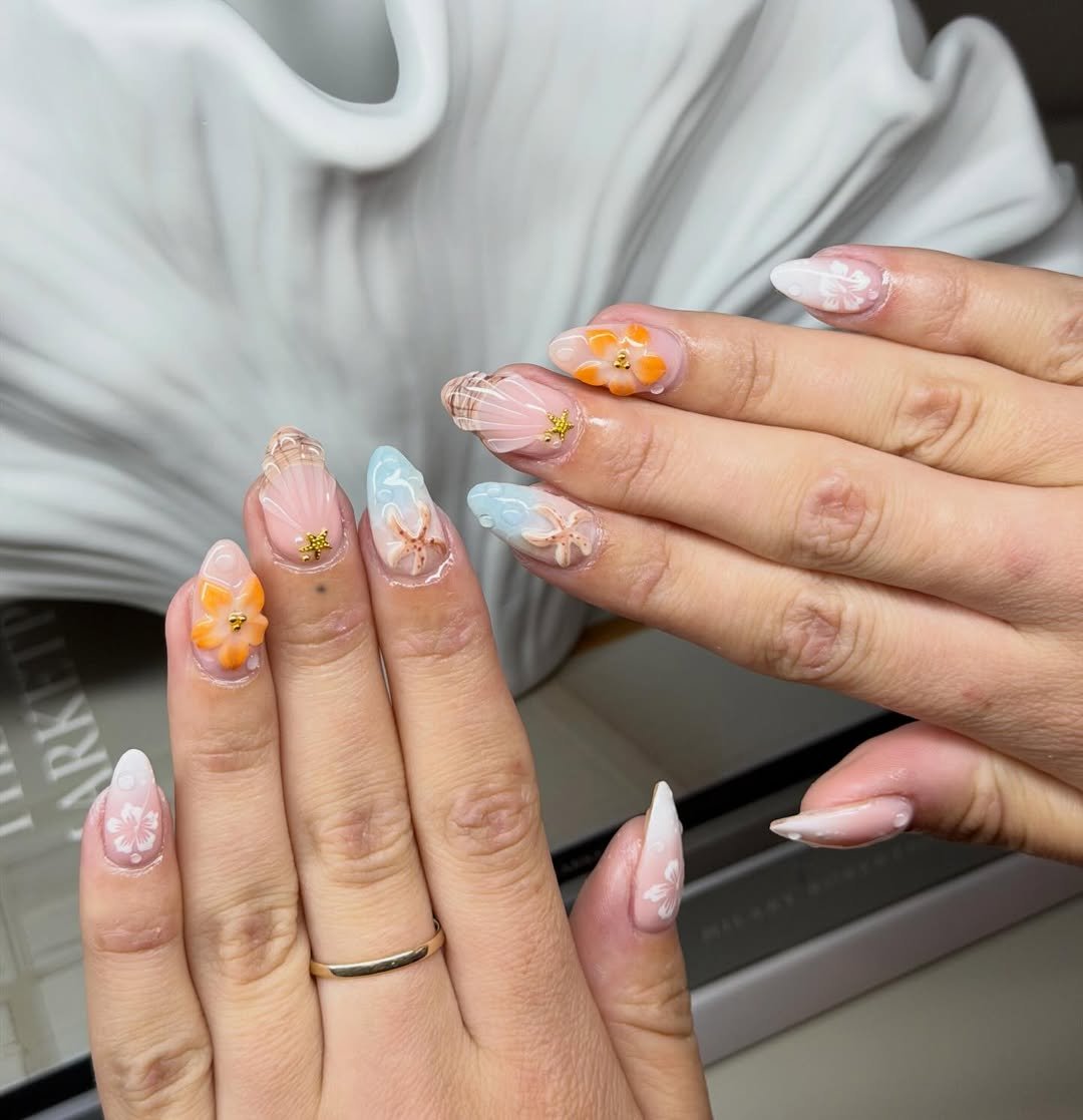 Soft nude bases transition into pink and peach tips that mimic the colors of a late summer sky. Tiny floral details sit gently on top, adding just enough charm.