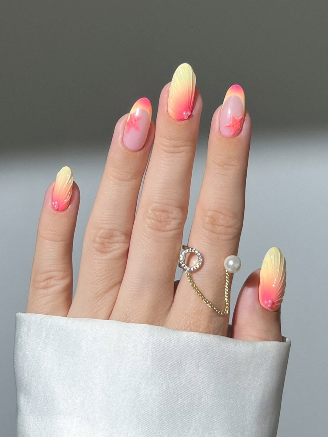 Warm yellow melts into coral at the tips, finished with raised starfish details that bring in a subtle coastal touch. The texture adds interest without taking over the look.