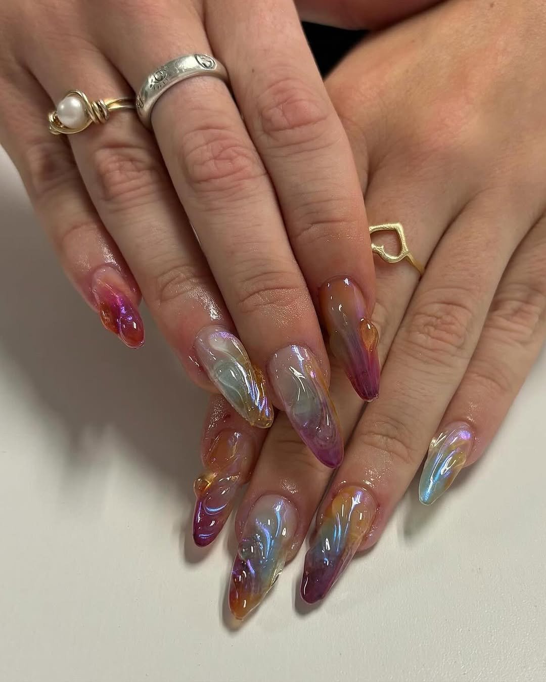 These nails shift between amber, lilac, and soft gold depending on the light, creating that dreamy, almost liquid chrome effect. The elongated shape adds drama, while the finish keeps it modern.