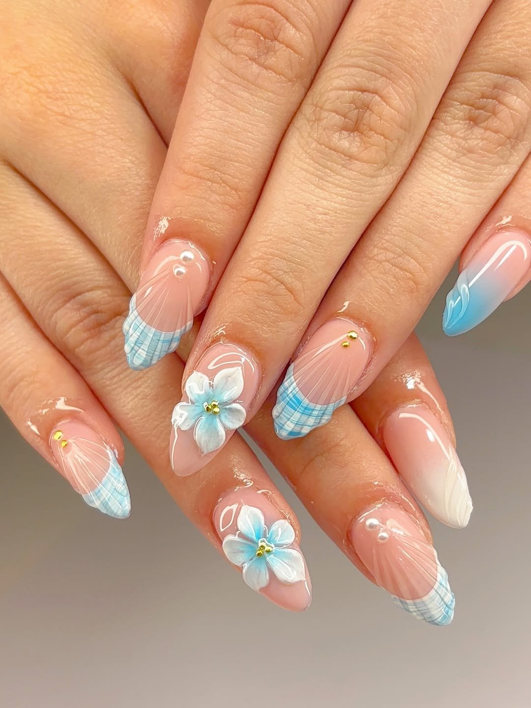 This design is the definition of soft and sweet. The delicate blue plaid tips paired with airy floral accents give the whole set a light, springtime feel.