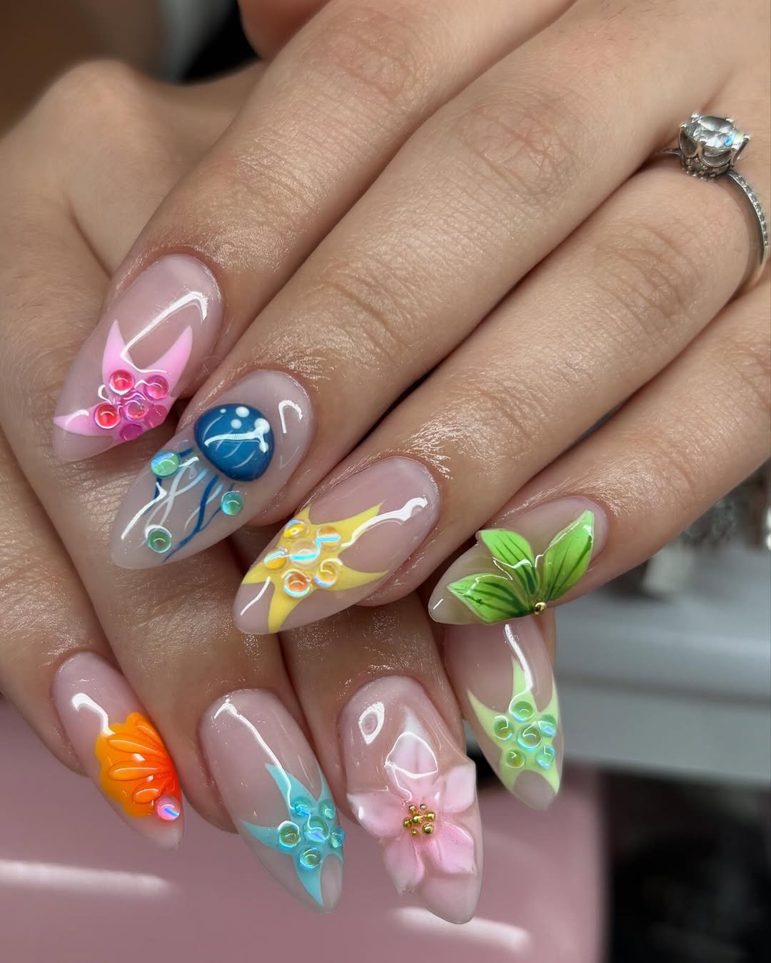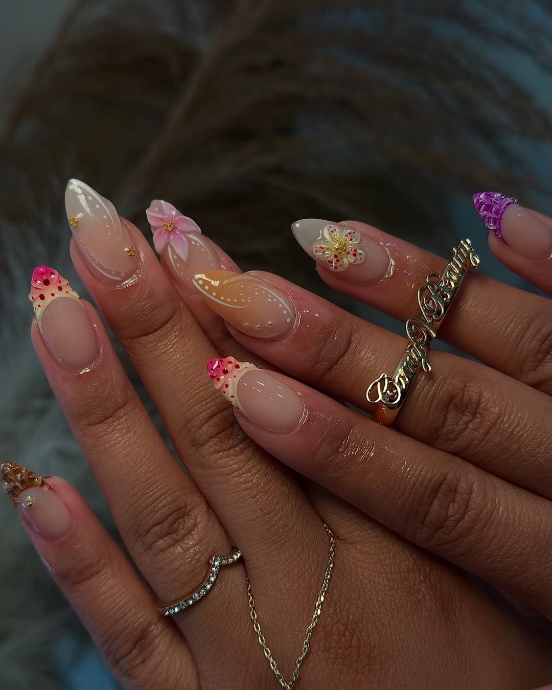 It’s bold but still elegant. Each nail brings something different, yet the soft pink palette ties everything together beautifully.