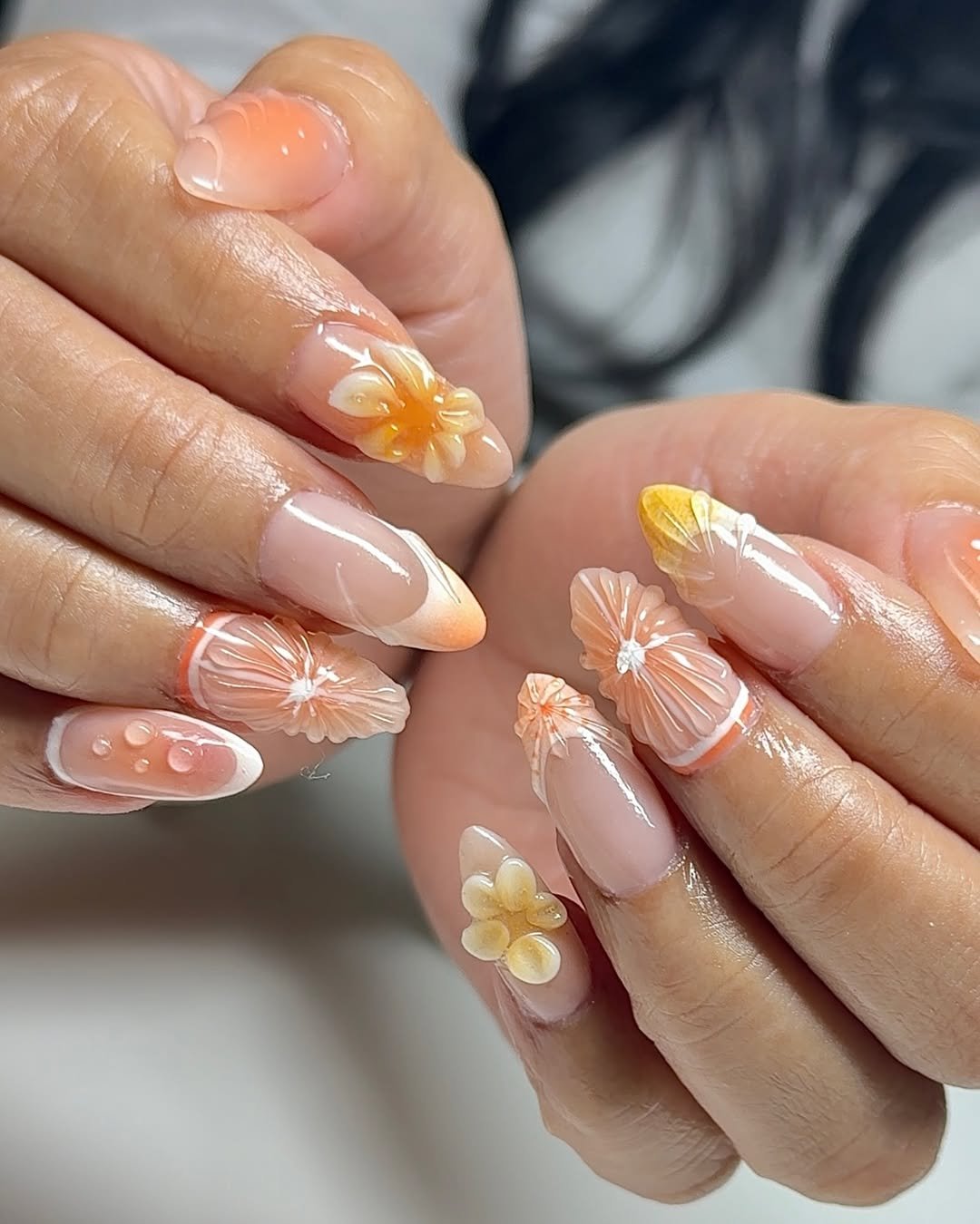 These nails feel like wearable art. The translucent citrus-inspired petals and soft orange tones create a delicate, almost glass-like effect.