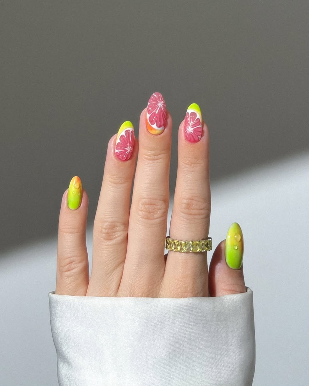 This manicure is basically sunshine on your fingertips. Bright lime green melts into juicy grapefruit-inspired art, giving the whole set a fresh, citrusy vibe that screams summer.