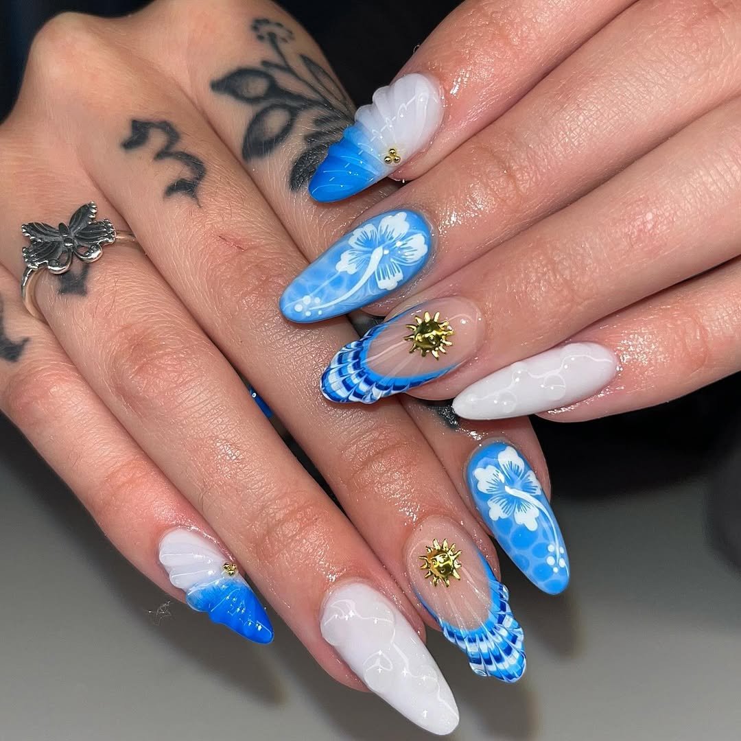 This beachy manicure is pure vacation energy. Soft sky-blue tones paired with flowing wave lines instantly bring ocean vibes to the nails.