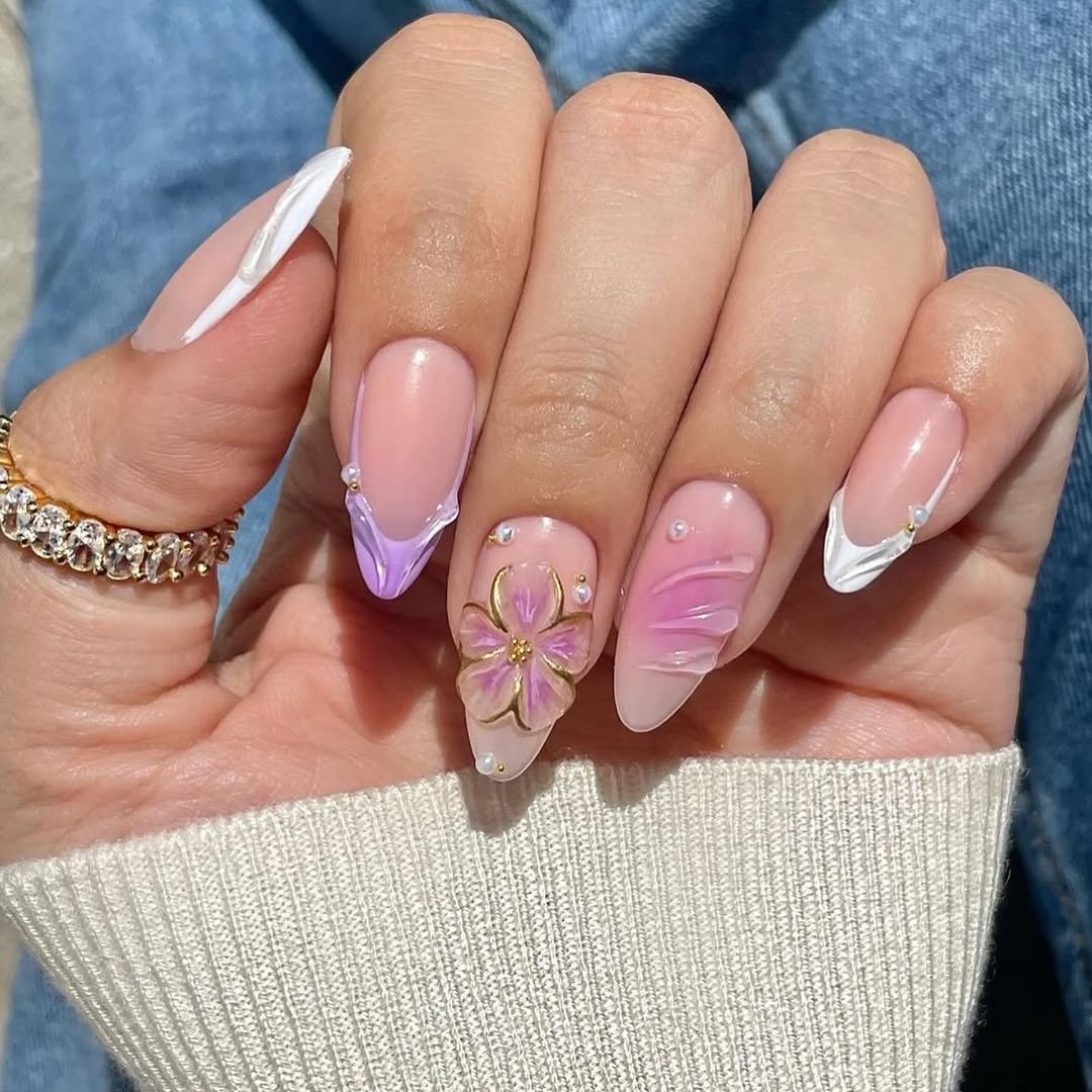 This manicure leans into soft elegance with glossy pink tones and delicate lavender accents. The sculpted floral detail adds just enough texture to make the design feel special.